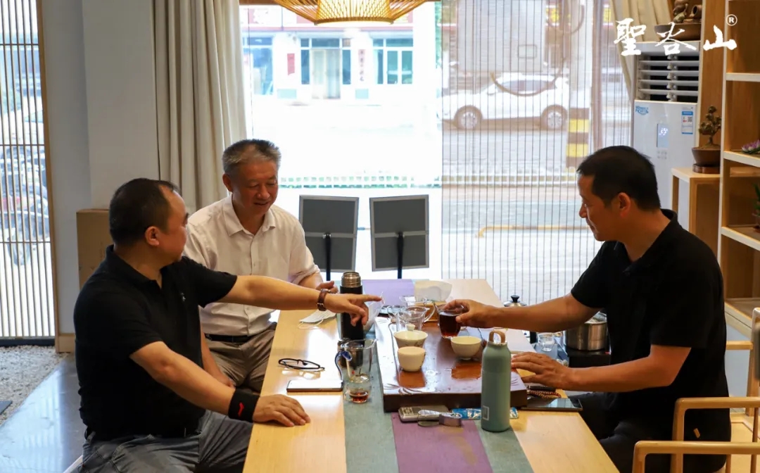 包小村(左二)、丁深根(左一)品評(píng)圣谷山白茯茶