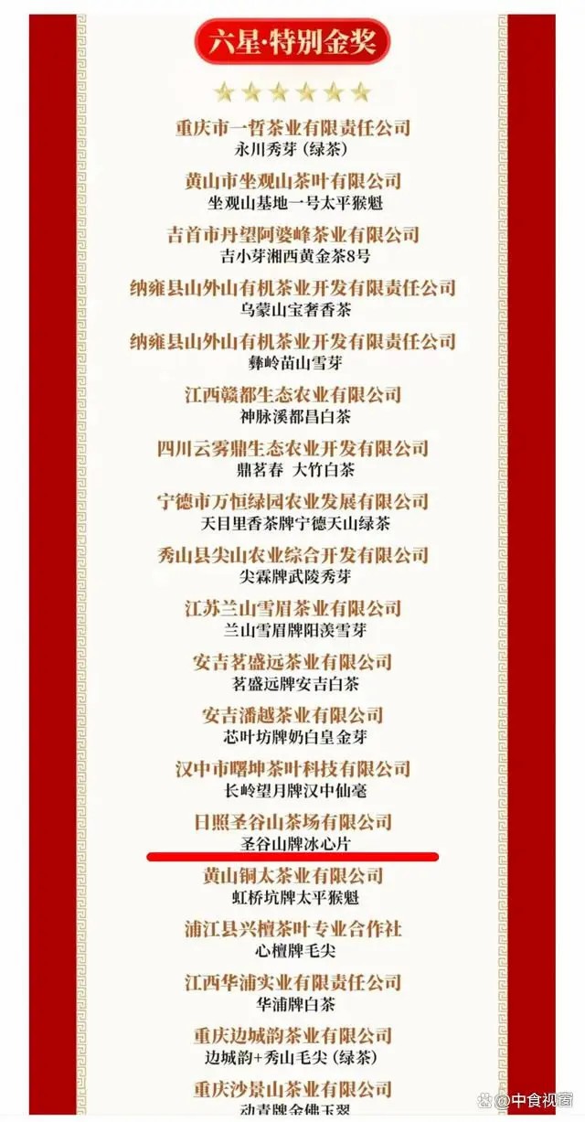 近日,“中茶杯”第十四屆國(guó)際鼎承茶王賽·春季賽獲獎(jiǎng)名單揭曉,圣谷山牌“冰心片”入選綠茶組獲獎(jiǎng)名單,獲評(píng)六星·特別金獎(jiǎng),日照圣谷山茶場(chǎng)為山東唯一獲此殊榮茶企。